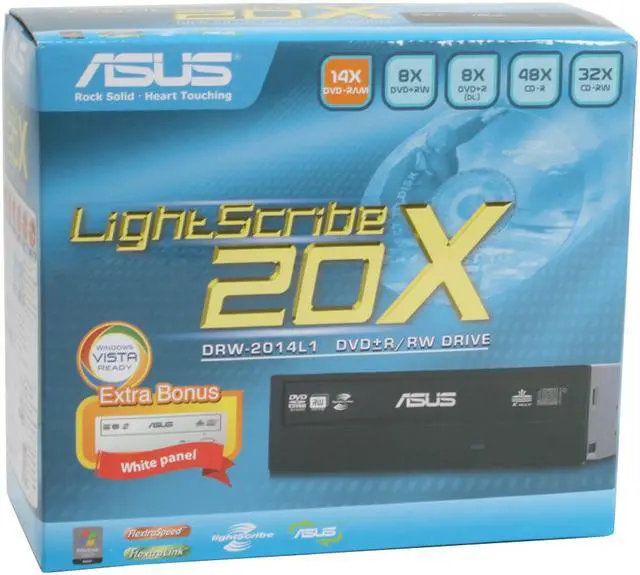 The Asus DRW-2014L1 DVD burner gives you 20X capability and impressive features, for smooth, reliable performance, every time. FlextraSpeed recognizes your destination media and sets the write speed for best recording quality. Using the drive's 2 MB buffer, FlextraLink prevents buffer under-run, so instead of bad disc "coasters," you get usable media, every time.