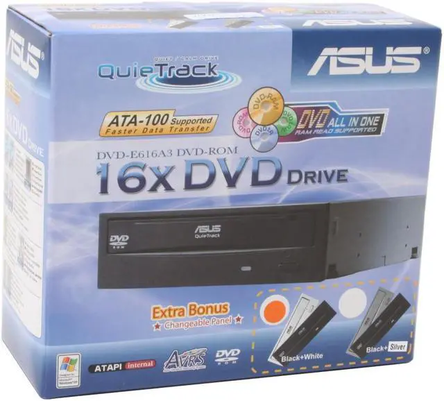 Full Accessibility and Playability ASUS DVD-E616A3 provides leading-edge multimedia experience with fabulous playback capacities that allows users to access all CDs, DVD-ROM/DVD±R/ DVD±RW and DVD-Video discs Auto Vibration Reducing System (AVRS) The AVRS technology is designed to minimize the vibration caused by the spindle motor and resonance between components as well as the drive and PC cases. AVRS is designed to reduce vibration and noise induced by unbalanced mass of rotating machinery. With AVRS, ASUS DVD-E616A3 provides high readability and playability