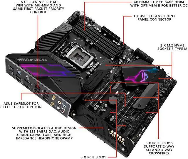 Designed for 9th and 8th generation Intel Core processors to maximize connectivity and speed with dual M.2, USB 3.1 Gen 2, onboard 802.11 ac Wi-Fi and ASUS OptiMem II for better DRAM overclocking stability