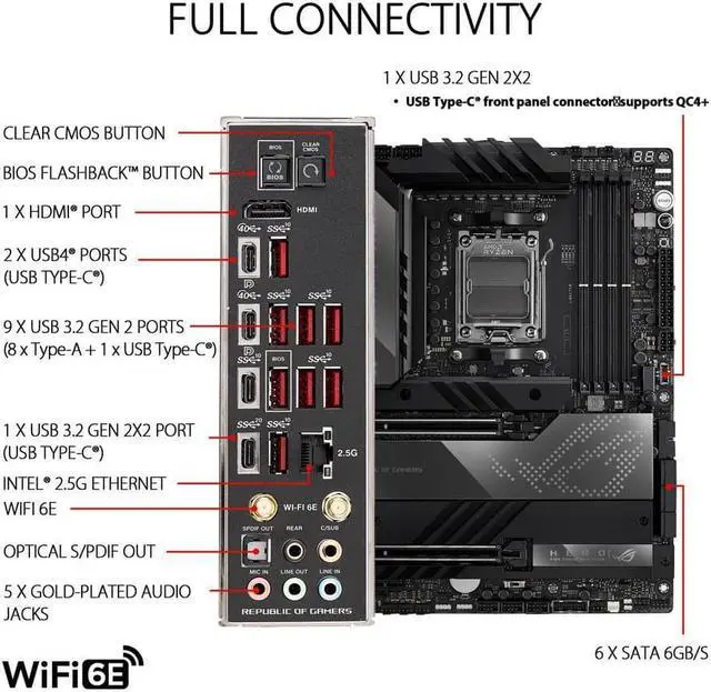 Fastest Gaming Connectivity: PCIe 5.0 expansion slot, dual PCIe 5.0 M. 2 onboard slots, M. 2 card with PCIe 5.0 support, USB 3.2 Gen 2x2 header with Quick Charge 4+ support, and dual USB4 Type-C ports.