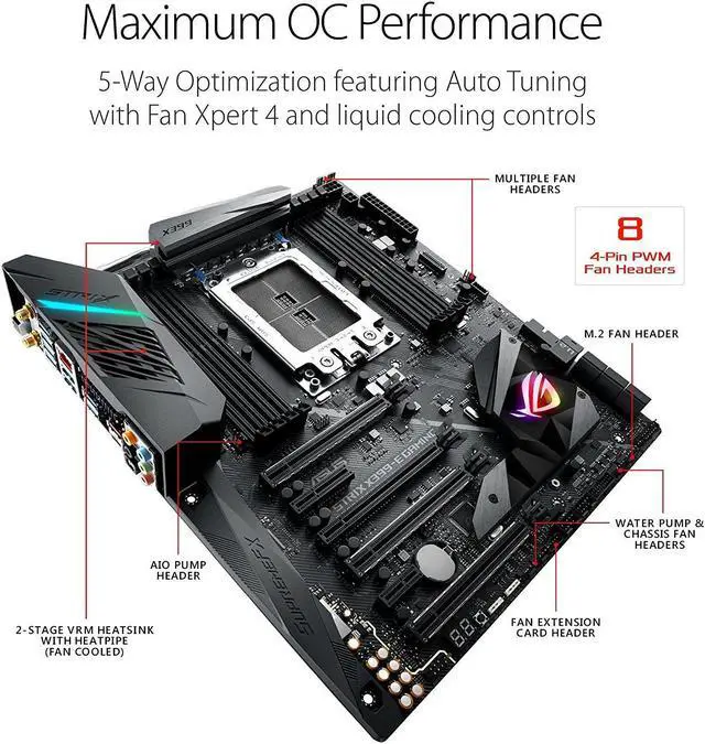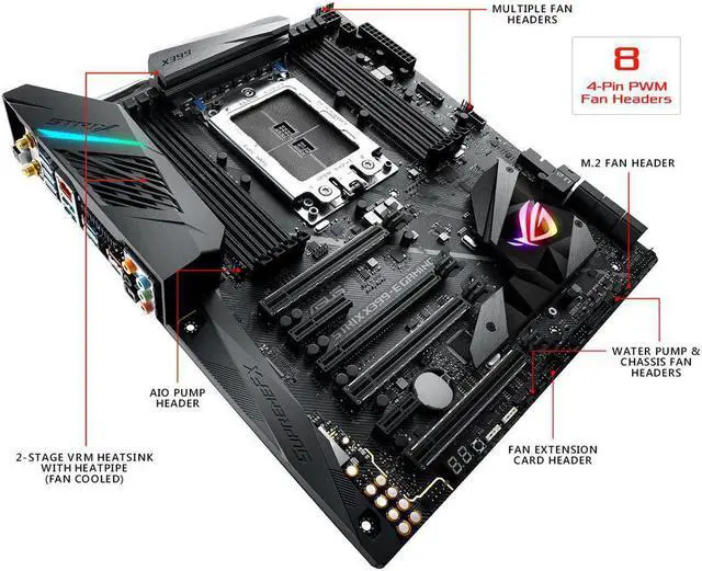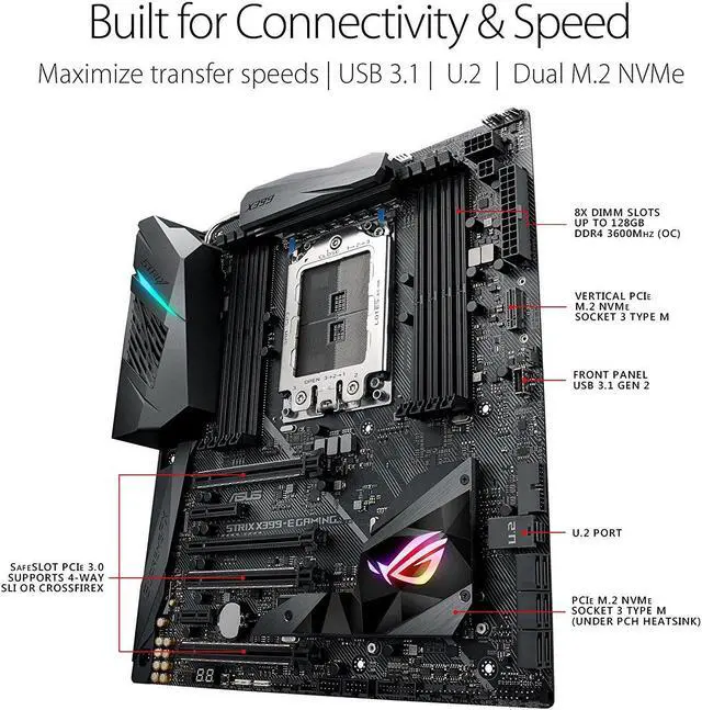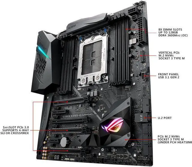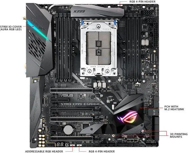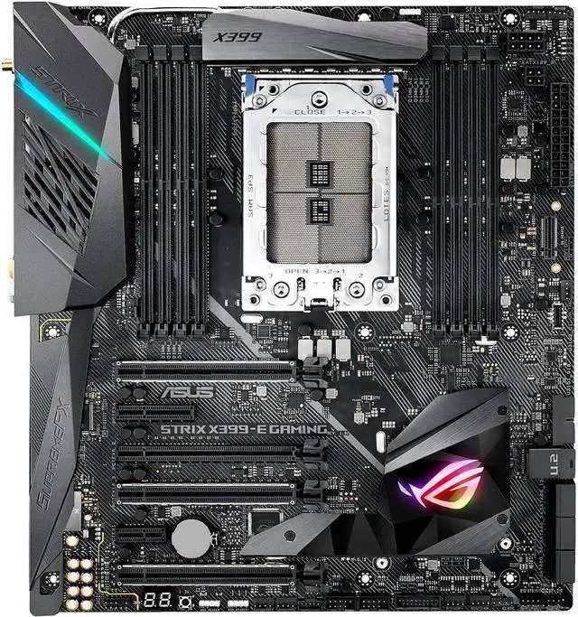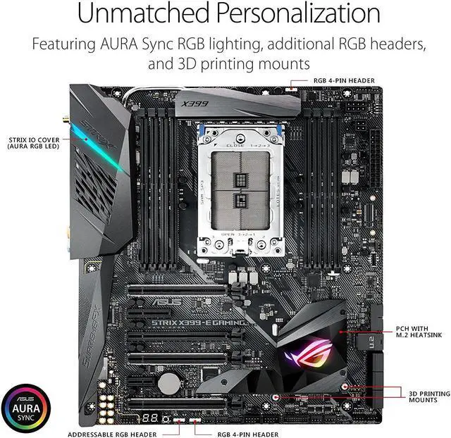 ROG Strix first motherboard for AMD's HEDT platform with the Strix X399-E. Designed to take hardcore gamers beyond playing, the Strix X399-E wraps powerful performance in a striking exterior that's easily personalized. Diffused Aura Sync RGB lighting cuts across the board like the slash of a katana, while standard and addressable headers take system illumination to the next level. With Ryzen Threadripper CPUs ready for gaming, streaming, and more, you can showcase your skills with unique style.