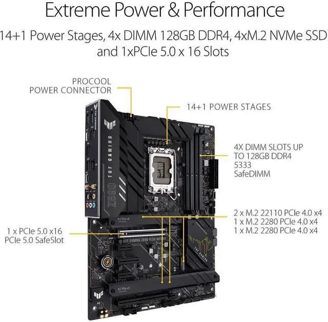Enhanced Power Solution: 14+2 DrMOS power stages, ProCool sockets, military-grade TUF components, and Digi+ VRM for maximum durability and performance