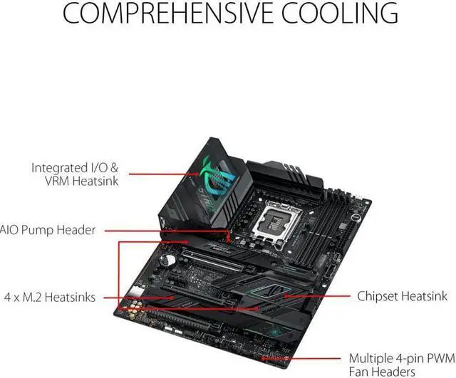 Optimized VRM Thermals: Massive heatsinks with integrated I/O cover, high-conductivity thermal pads, and connected with an L-shaped heatpipe.