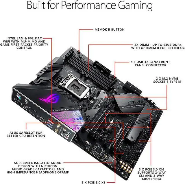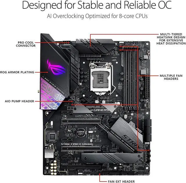 Fully Command your gaming experience on 9th generation Intel Core processors with the ROG Strix Z390-E Gaming featuring 5-Way Optimization for dynamic system control with AI overclocking. Dual M.2, 802.11AC Wi-Fi and USB 3.1 Gen2 deliver maximum connectivity speeds while ASUS optimum II ensures better DRAM overclocking stability.