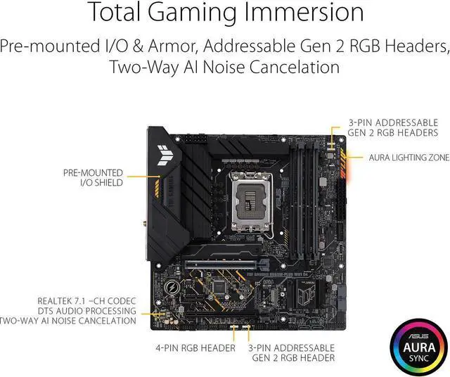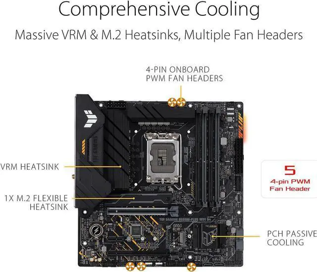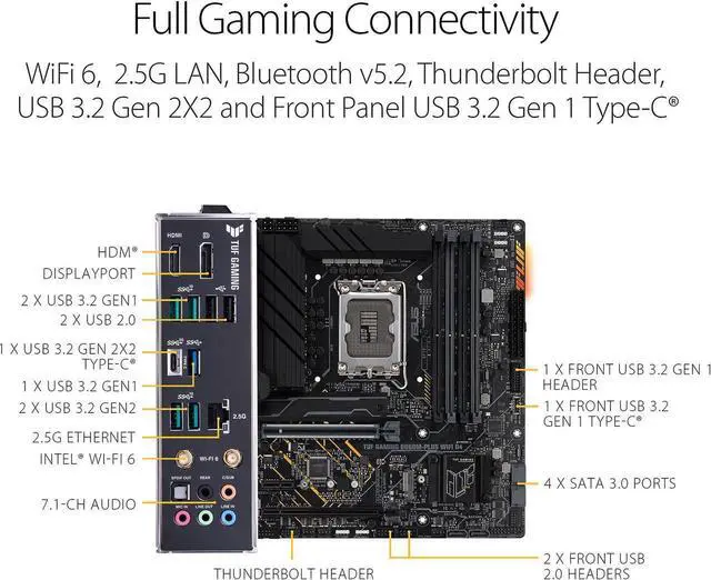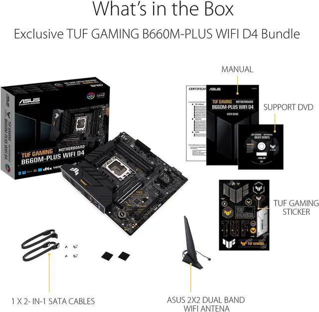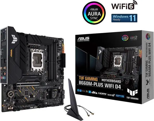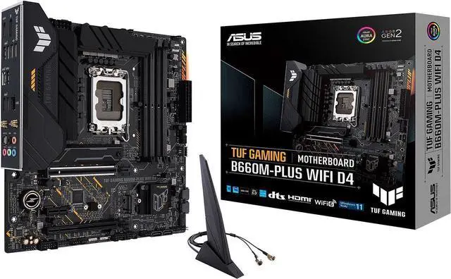 The ASUS TUF Gaming B660M-PLUS WiFi D4 is a micro-ATX motherboard designed for Intel's 12th, 13th, and 14th Gen processors using the LGA 1700 socket. It supports DDR4 memory up to 5333 MHz (OC) and features PCIe 5.0 for next-gen graphics cards, along with dual PCIe 4.0 M. 2 slots for high-speed NVMe storage. Networking capabilities include Intel Wi-Fi 6 and 2.5 Gb Ethernet, ensuring fast and reliable connectivity. The motherboard also offers immersive audio with Realtek 7.1 surround sound and DTS Audio Processing, as well as customizable RGB lighting through ASUS Aura Sync.