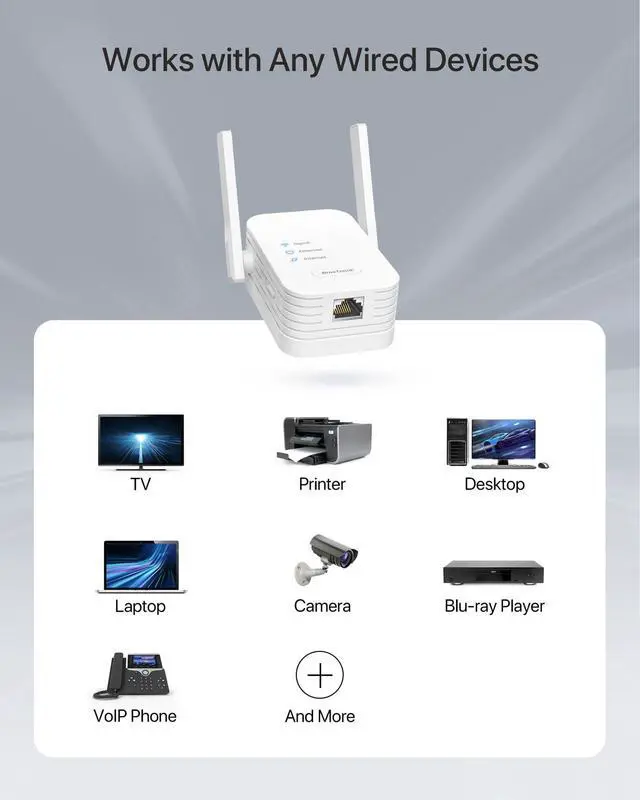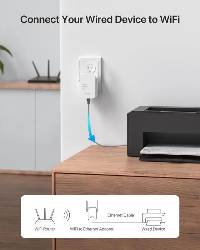 Relocate the adapter halfway between your router and your device. Connect your wired device to the adapter with an Ethernet cable. Setup is done!