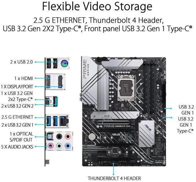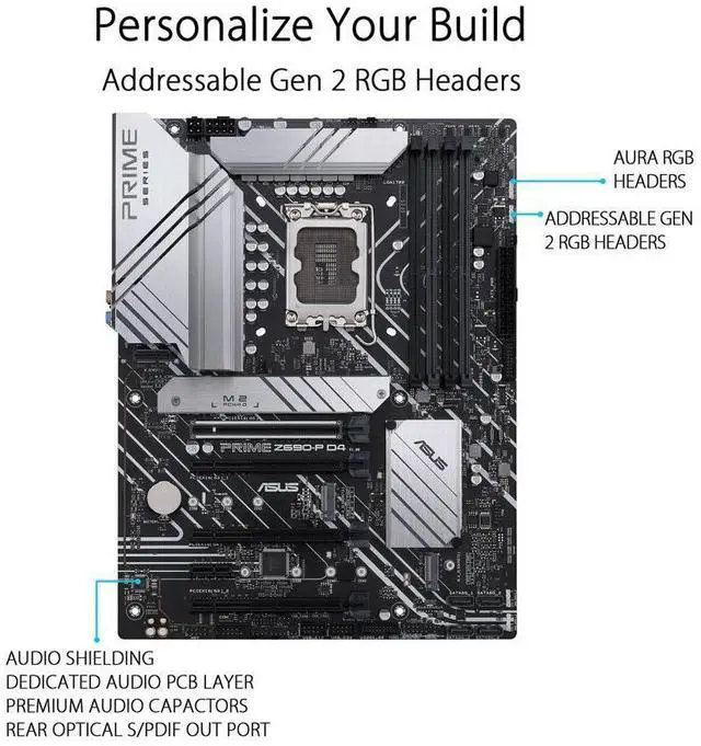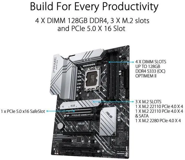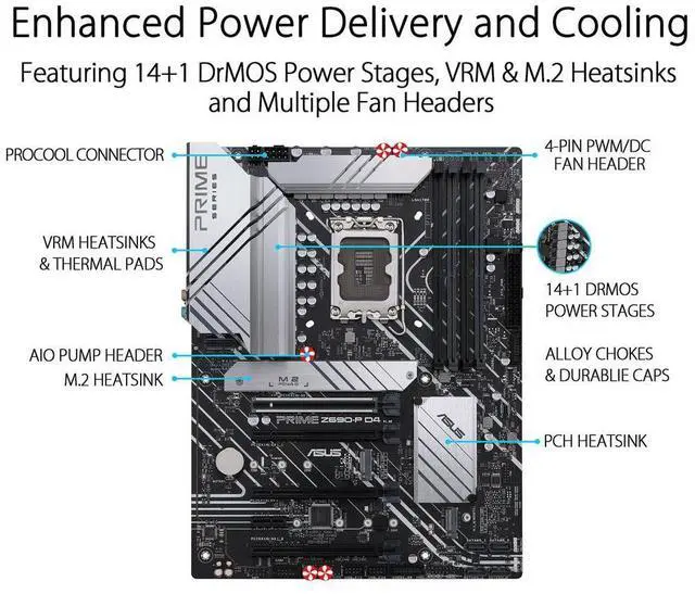 The ASUS Prime Z690-P D4 is expertly engineered to unleash the full potential of 12th Gen Intel Core processors. Boasting a robust power design up to 14+1 DrMOS power stages, comprehensive cooling solutions and intelligent tuning options, the ASUS Prime Z690-P provides daily users and DIY PC builders a range of performance tuning options via intuitive software and firmware features.