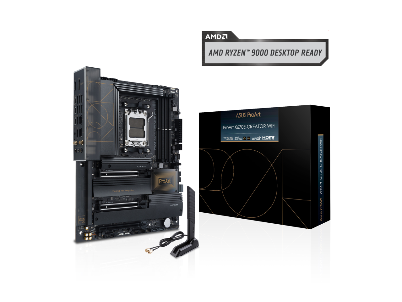 ASUS ProArt X670E-CREATOR WIFI AMD X670 AM5 Ryzen Desktop 9000 8000 & 7000 ATX motherboard, 16+2 power stages, PCIe 5.0 ready, DDR5 support, USB4, 10 Gb & 2.5 Gb LAN, WiFi 6E, four M.2 slots