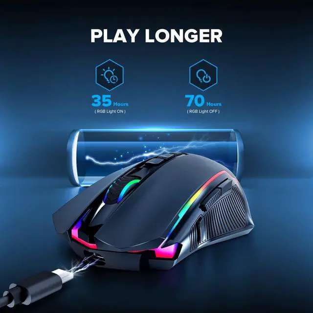 The wireless gaming mouse has a battery life between 35 hours (RGB on) and 70 hours (RGB off) on a single charge, provide you with nonstopping using.