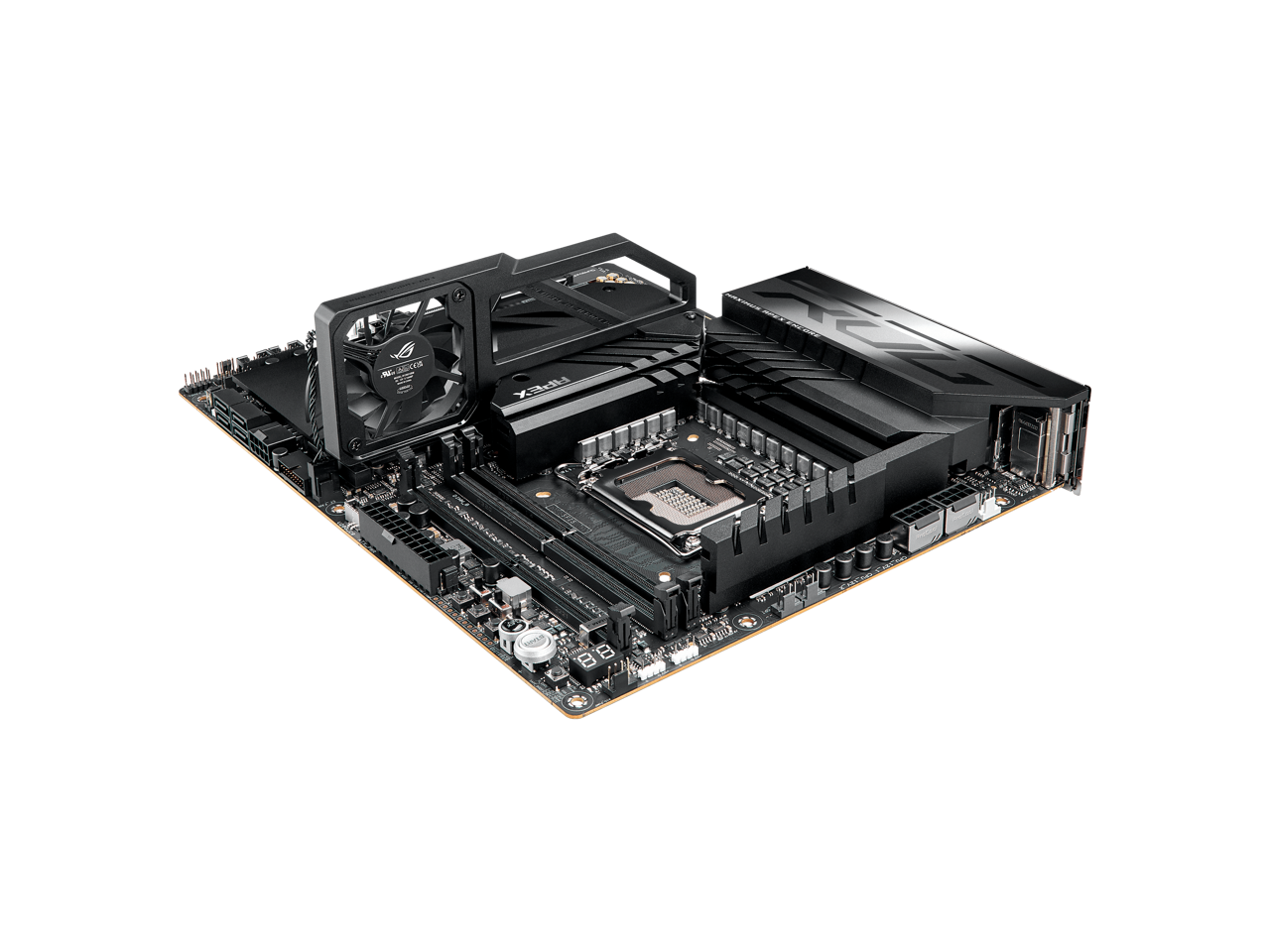 Latest M.2 Support: Onboard PCIe 5.0 M.2 slot, two onboard PCIe 4.0 M.2 slots, and two PCIe 4.0 M.2 slots on an ROG DIMM.2 card, all with substantial cooling solutions