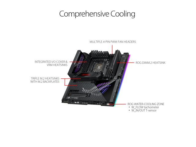 - Next-Gen M.2 Support: On-board PCIe® 5.0 M.2 slot and two PCIe 4.0 M.2 slots all with front and back heatsinks, and two additional PCIe 4.0 M.2 slots on the ROG DIMM.2.
