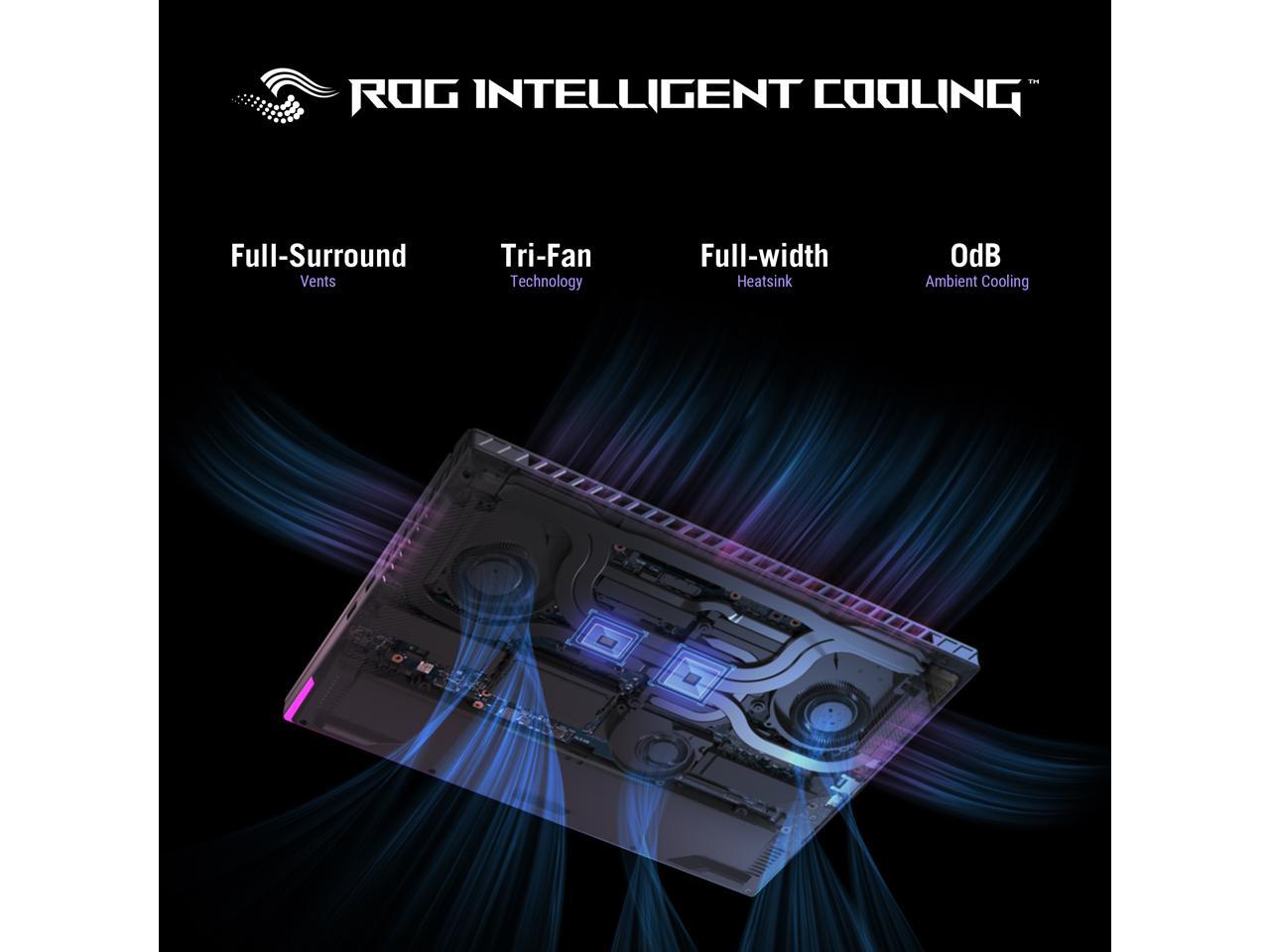 - ? STATE-OF-THE-ART ROG INTELLIGENT COOLING – ROG’s advanced thermals keep your system cool, quiet and comfortable. State of the art cooling equals best in class performance. Featuring Tri-Fan technology, full-width heatsink, and full-surround vents.