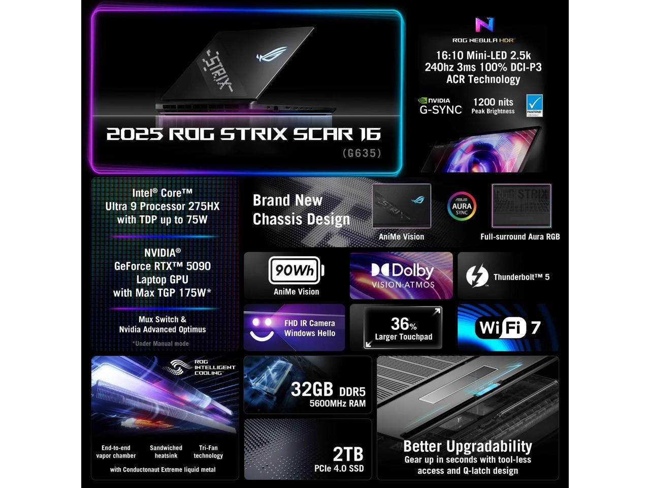 ASUS ROG Strix SCAR 16 (2025) Gaming Laptop, 16 ROG Nebula HDR 2.5K 240Hz Display, Intel Ultra 9 275HX Processor, 32GB RAM, 2TB SSD, NVIDIA RTX 5090, Windows 11 Pro - Black