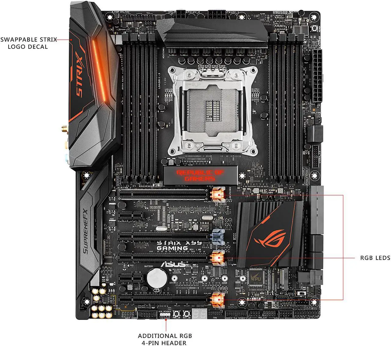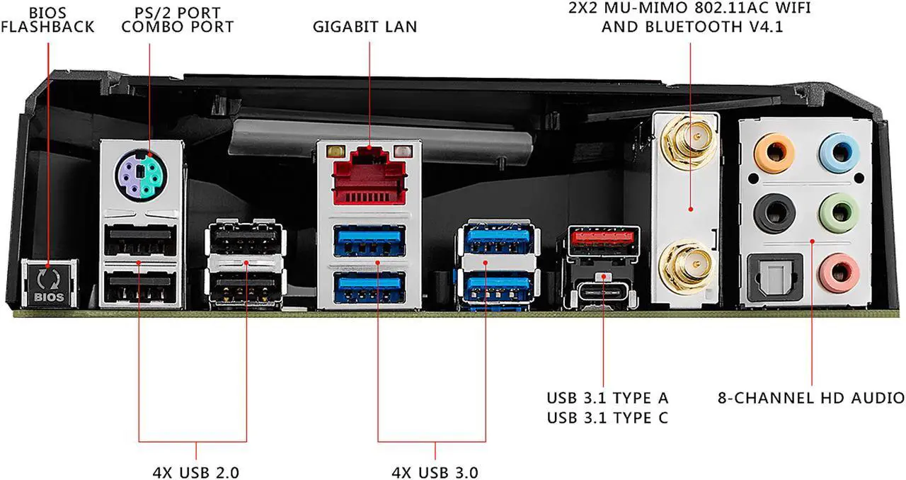 Special Features: 5-Way Optimization by Dual Intelligent Processors 5 - 5-Way Optimization tuning key perfectly consolidates TPU, EPU, DIGI+ VRM, Fan Xpert 4, and Turbo Core App Gamer's Guardian: - ESD Guards on LAN, Audio, KBMS and USB3.1/3.0/2.0 ports - DRAM Overcurrent Protection - Stainless Steel Back I/O - Highly Durable Components - DIGI+ VRM ASUS Exclusive Features: - USB BIOS Flashback - MemOK! - AI Suite 3 - Ai Charger+ - ESD Guards - USB 3.0 Boost - USB 3.1 Boost - Disk Unlocker - Mobo Connect - PC Cleaner ASUS Quiet Thermal Solution: - ASUS Fan Xpert 4 ASUS EZ DIY: - ASUS CrashFree BIOS 3 - ASUS EZ Flash 3 - Push Notice ASUS Q-Design: - ASUS Q-Shield - ASUS Q-Code - ASUS Q-LED (CPU, DRAM, VGA, Boot Device LED) - ASUS Q-Slot - ASUS Q-DIMM - ASUS Q-Connector RAMCache AURA: RGB Lighting Control
