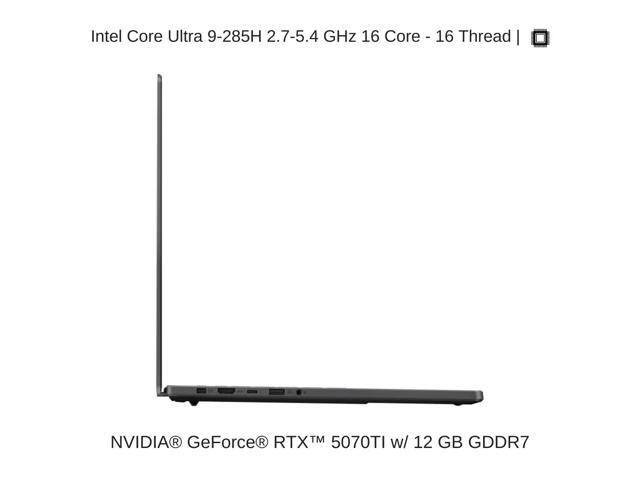 - Intel Core Arrow Lake Ultra 9-285H 16 Core - 16 Thread Processor, 2.7 GHz (Max Turbo Frequency 5.4 GHz), 24 MB Smart Cache with NVIDIA GeForce RTX 5070 Ti w/ 12 GB GDDR7