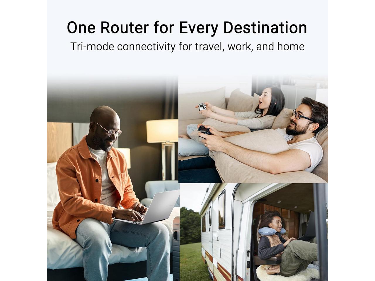 - Tri-mode connectivity for travel, work and home with 4G/5G mobile tethering, a private hotspot over public WiFi (WISP mode), and router mode.