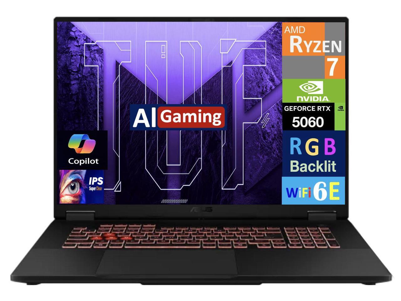 ASUS TUF AI Gaming Laptop 18" 144Hz IPS WUXGA Display (AMD Ryzen 7 260, NVIDIA GeForce RTX 5060 8GB, 32GB DDR5, 2TB PCIe SSD, RGB KB, WiFi 6E, Webcam, Bluetooth 5.4, Win 11 Home)