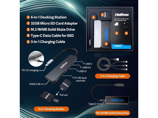 - Bonus Hotface Extension Set1x 128GB M.2 NVME Solid State Drive, 1x Type-C Data Cable for SSD, 1x 6-in-1 Docking Station, 1x 32GB Micro SD Card Adapter, 1x 3-in-1 Charging Cable.