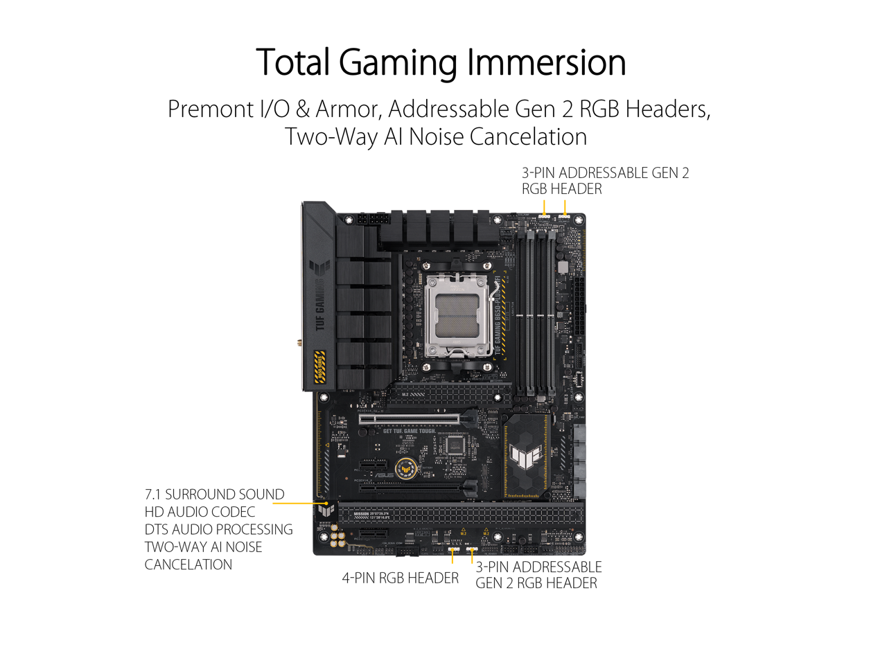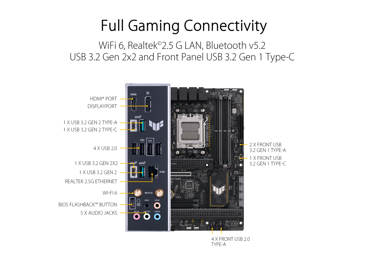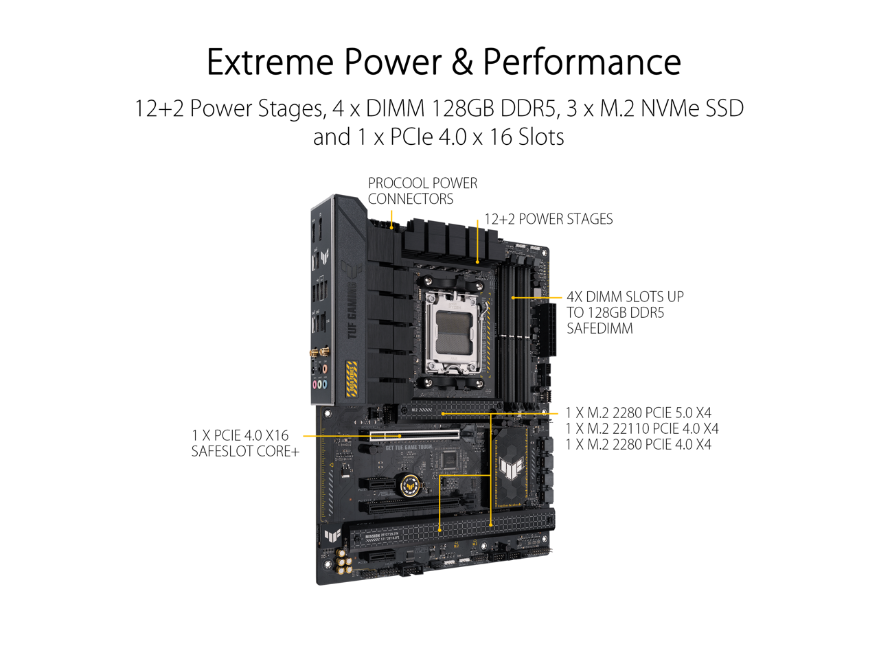ASUS TUF GAMING B650-PLUS WIFI AMD B650 AM5 Ryzen™ Desktop 9000 8000 and 7000 ATX motherboard, 14 power stages, PCIe® 5.0 M.2 , DDR5 memory, WiFi 6 and 2.5 Gb Ethernet, USB4® support Aura Sync