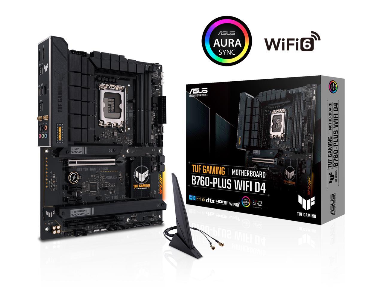 ASUS TUF GAMING B760-PLUS WIFI D4 Intel B760 (13th and 12th Gen) LGA 1700 ATX motherboard with PCIe 5.0, three PCIe 4.0 M.2 slots, DDR4, Realtek 2.5Gb Ethernet, DisplayPort, HDMI, SATA 6 Gbps, USB 3.2 Gen 2x2 Type-C