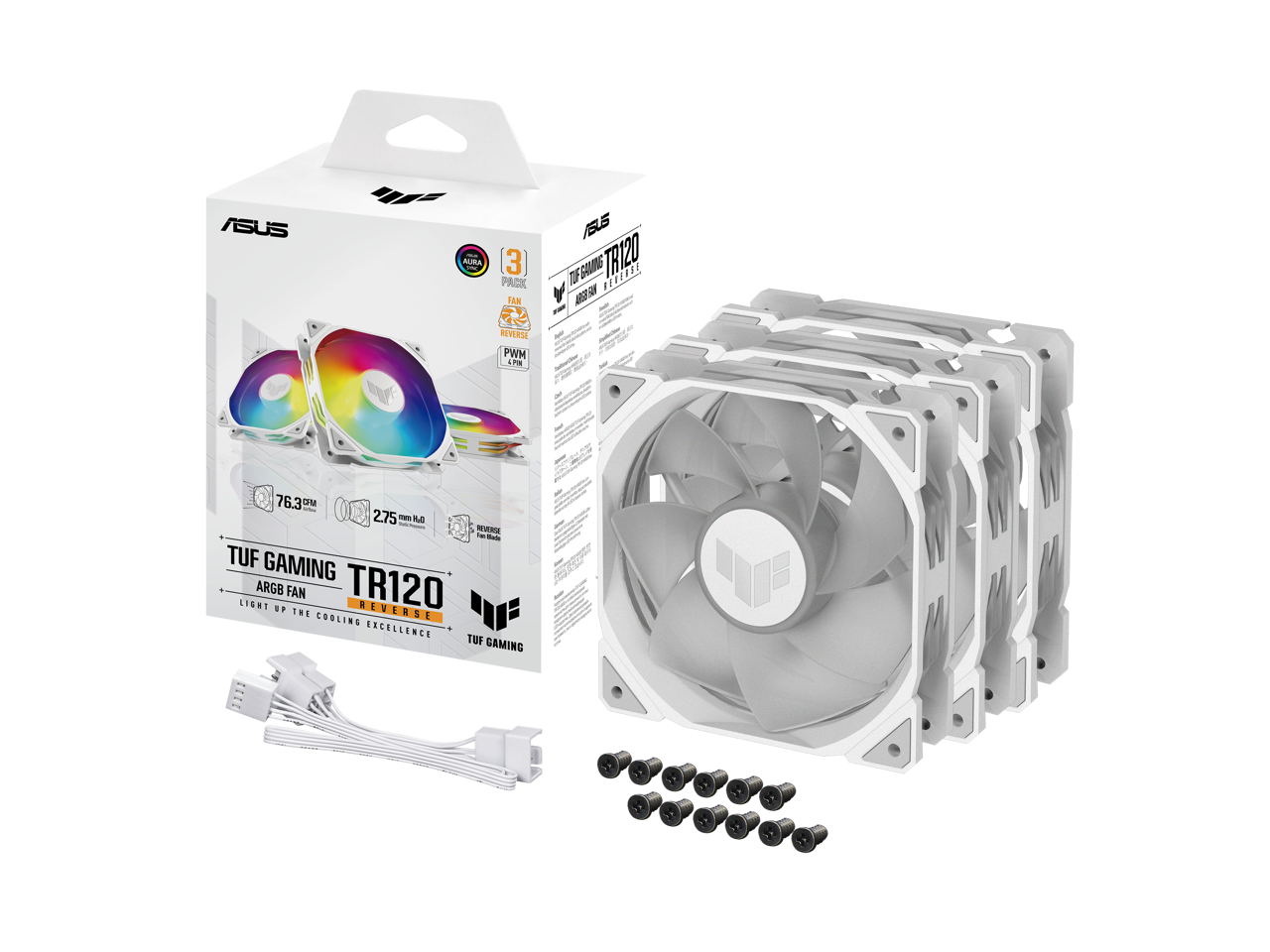 ASUS TUF Gaming TR120 120mm ARGB White Reverse Fan Blade Triple Pack 28mm Fan Frame, 2.75mm H2O Static Pressure, 76.3 CFM Airflow, Double-layer LED Array, Flexible Side Pattern, Aura Sync, PWM fan