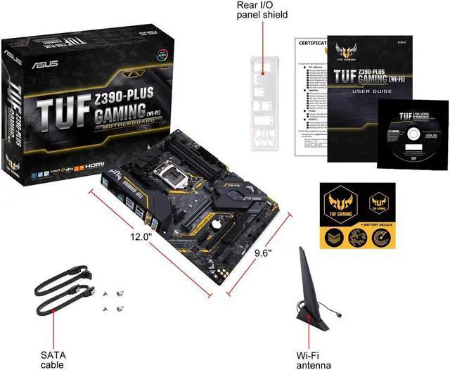 Accessories: User's manual I/O Shield 2 x SATA 6Gb/s cable(s) 1 x M.2 Screw Package 1 x ASUS 2T2R dual band Wi-Fi moving antennas (Wi-Fi 802.11 a/b/g/n/ac compliant) 1 x TUF Gaming Sticker 1 x TUF Certification card(s) 1 x SCD (by region)