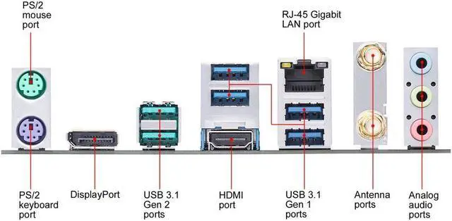 1 x PS/2 keyboard (purple) 1 x PS/2 mouse (green) 1 x DisplayPort 1 x HDMI 1 x LAN (RJ45) port(s) 2 x USB 3.2 Gen 2 Type-A 4 x USB 3.2 Gen 1 Type-A 2 x Wi-Fi antenna port(s) 3 x 8-channel Audio I/O