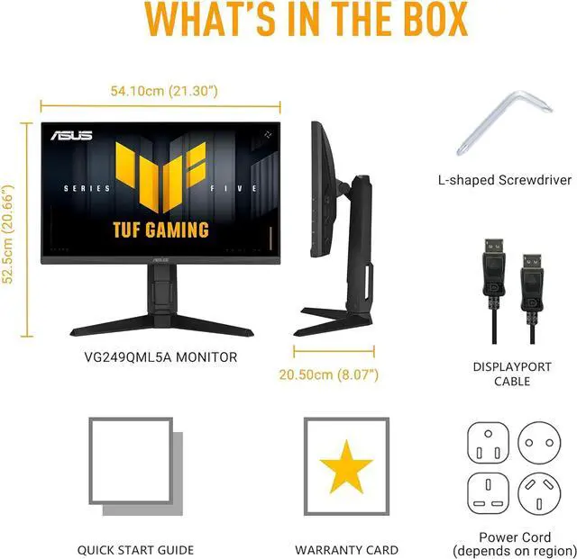 What’s in the box: DisplayPort cable, L-shaped Screwdriver, Power cord, Quick start guide, Warranty Card