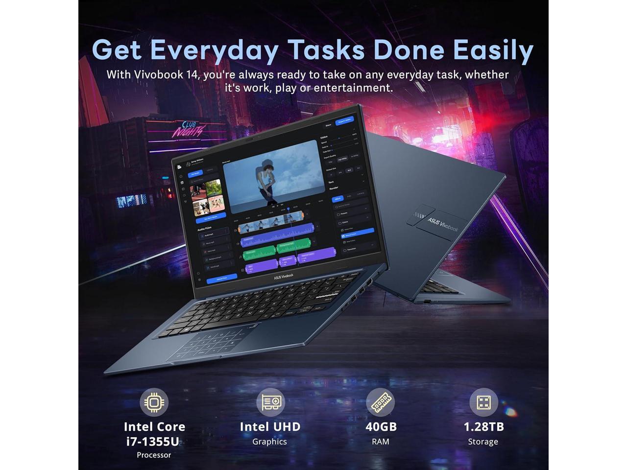 ASUS Vivobook 14" FHD Business Laptop, Intel i7-1355U, 40GB RAM,1.28TB Storage(1TB SSD+288GB Docking Station Set),Intel UHD Graphics, Number Pad, Webcam, Win 11, Quiet Blue