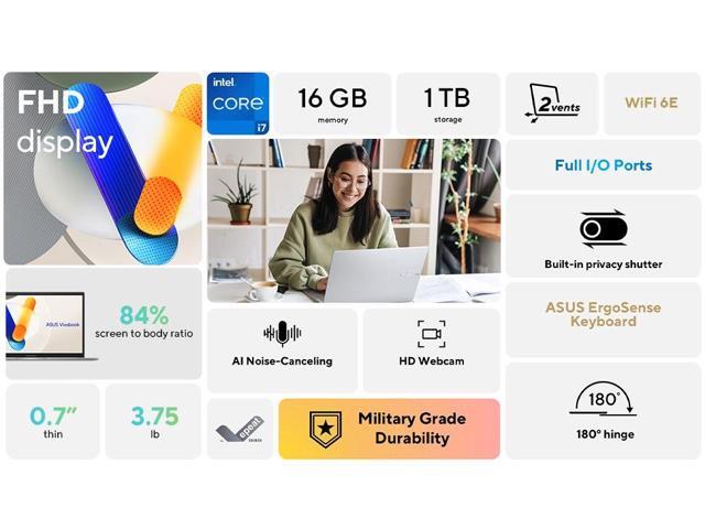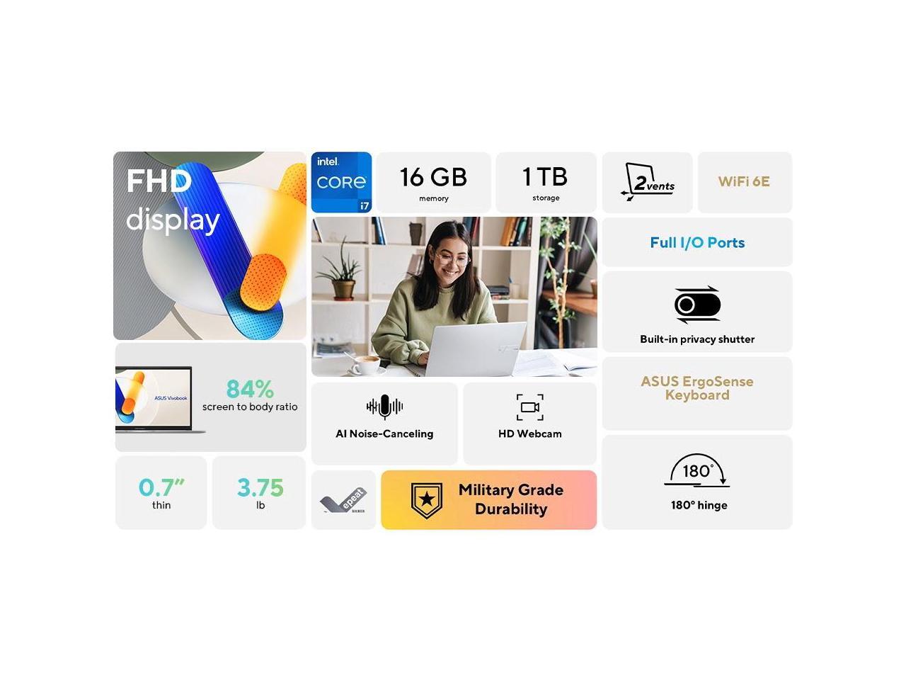 ASUS Vivobook Laptop, 15.6" FHD Touchscreen 60Hz 250 nits Display, Intel Core i7-1355U, 16GB RAM 1TB PCIe SSD, Intel Iris Xe Graphics, Wi-Fi 6E, Bluetooth 5.3, Backlit Keyboard, Win11 Home