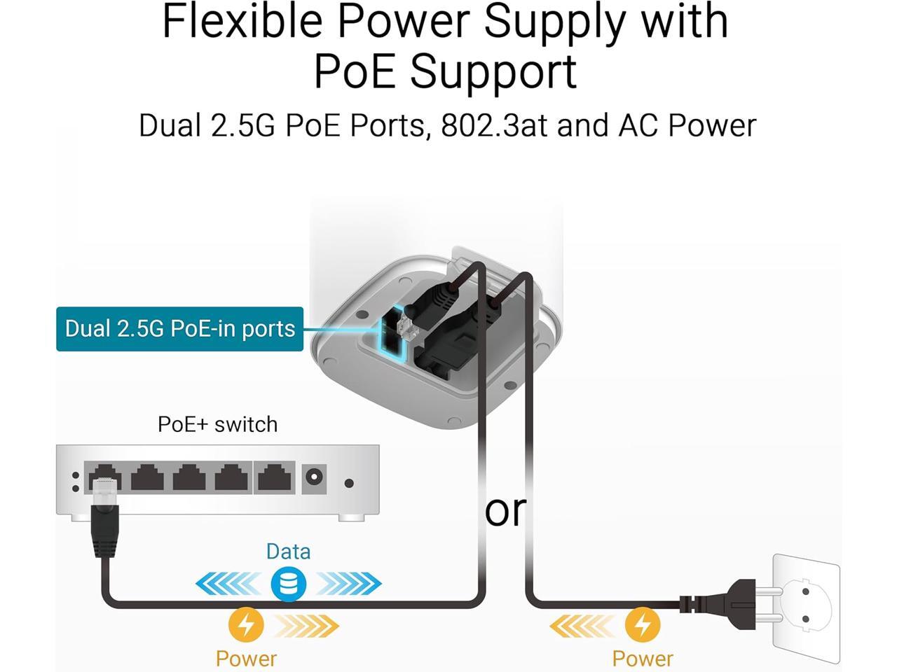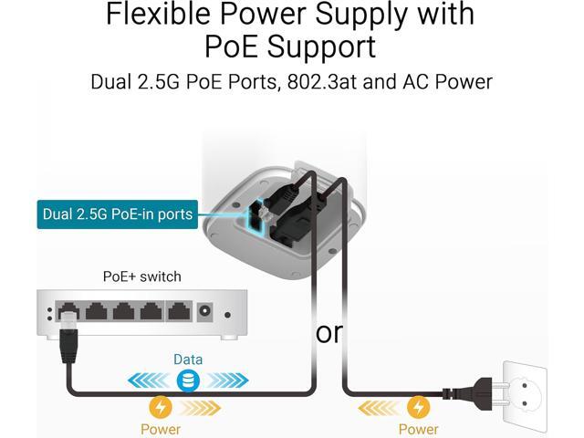 - Supports both Power over Ethernet and AC power for streamlined installation options, with two 2.5G PoE-in ports featuring AI WAN detection.