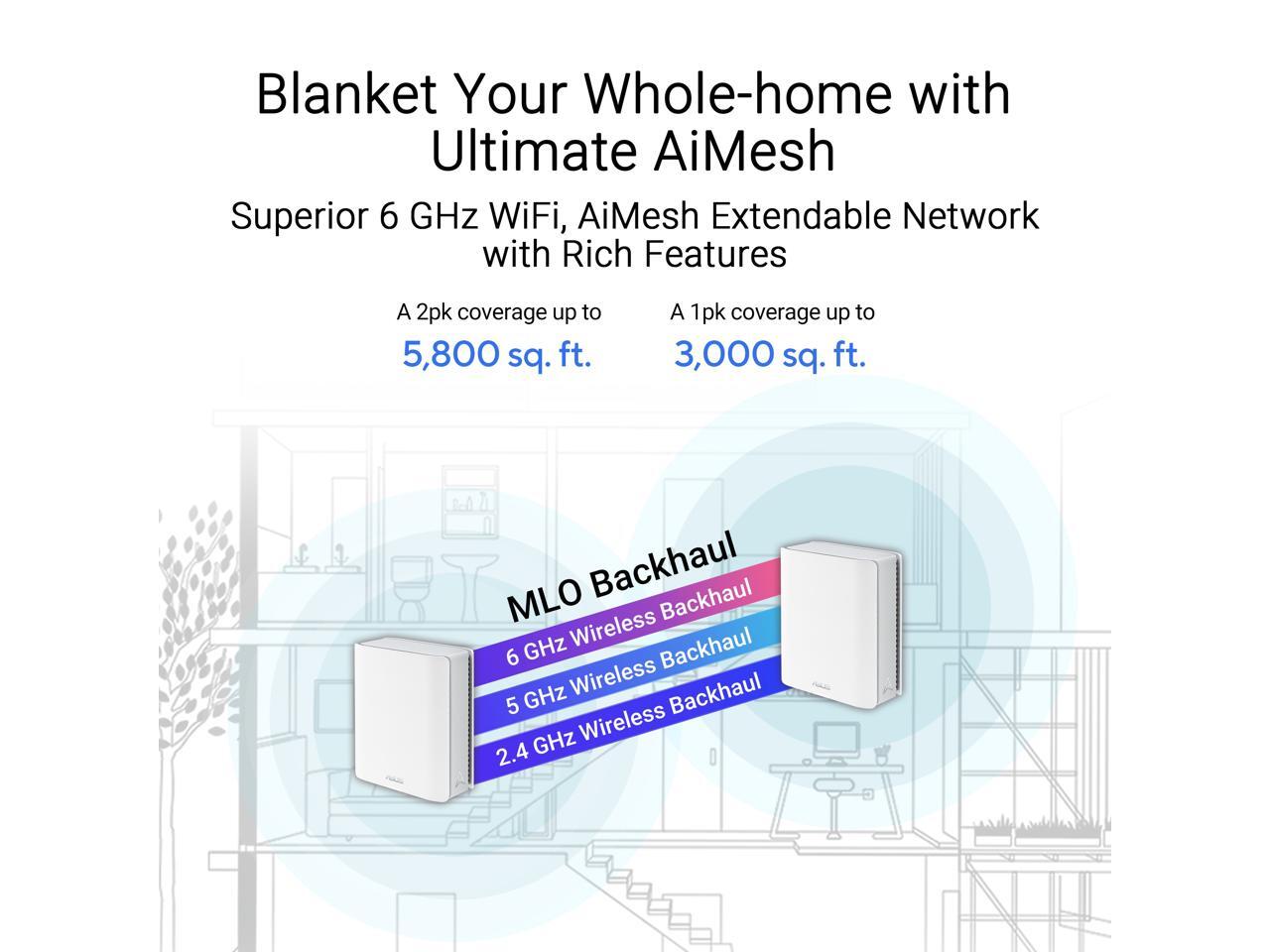 - AI-powered Smart AiMesh boosts coverage up to 7600 sq.ft. (3pk) and easy extendibility with compatible ASUS routers for seamless and secure whole home WiFi