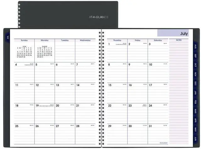 Monthly spreads feature ruled daily blocks, a section for notes and past/future reference calendars