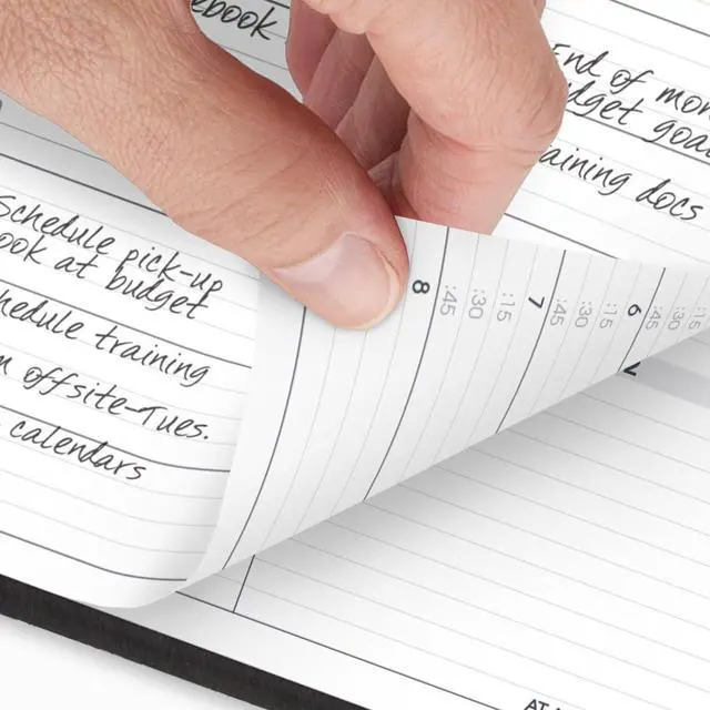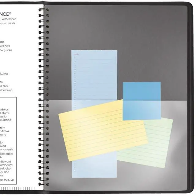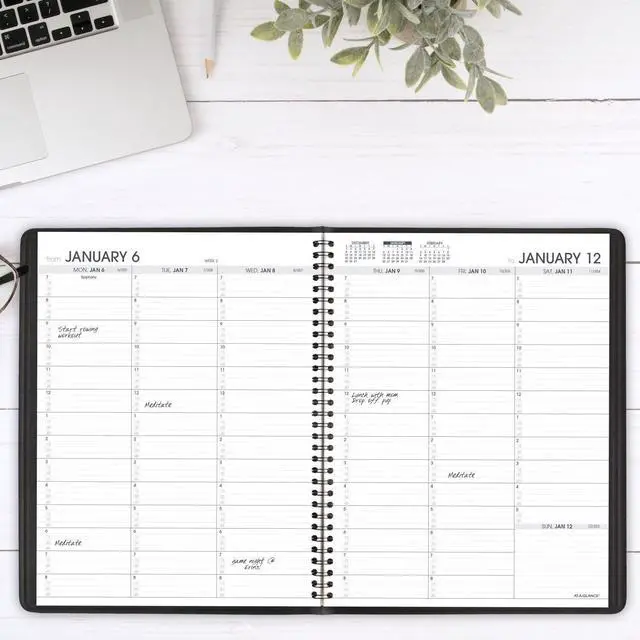 • Planner has a black faux leather cover and twin wire binding to help prevent snags and secure pages