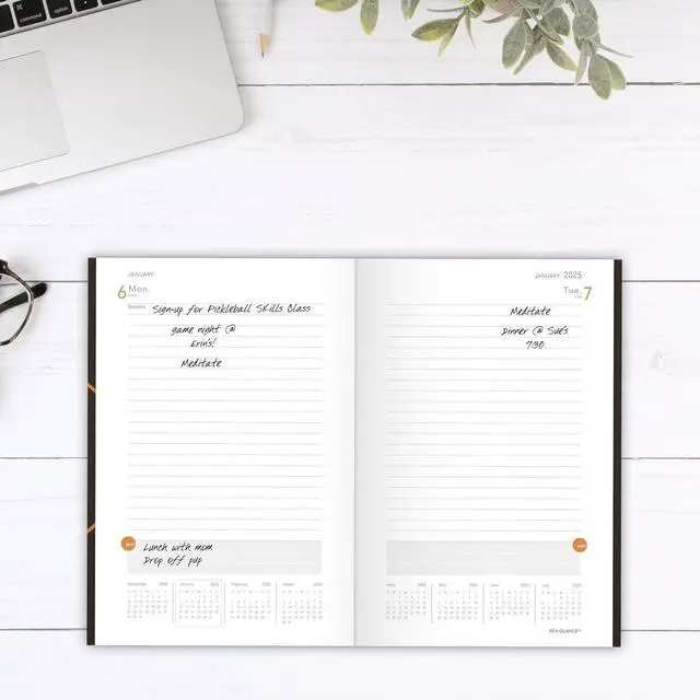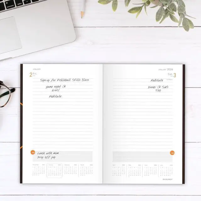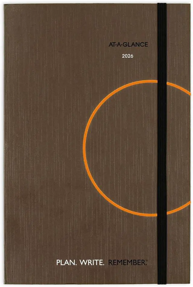 AT-A-GLANCE® Plan. Write. Remember.® Daily Planning Notebooks^^Covers 12 months from January 2026 - December 2026 with Julian dates. Guaranteed to last all year.*^^One day per page features ruled planning sections with HOT Spot reminders to track important details. Reference calendars are shown across the bottom for quick date checking. Pages measure 5" x 8 1/4".^^Special features include a 3-year reference calendar, monthly reference pages, a quick reference guide, event planning and index^^A bungee closure keeps everything secure, while a durable gray cover and casebound design help keep pages in place