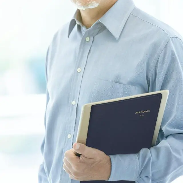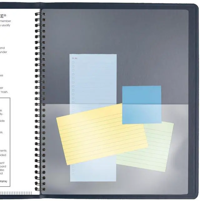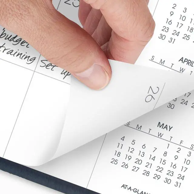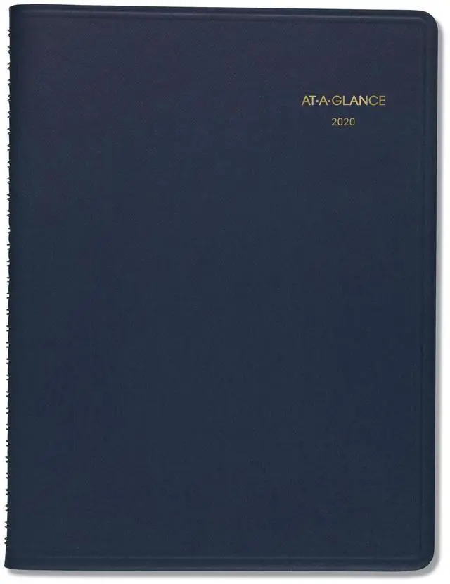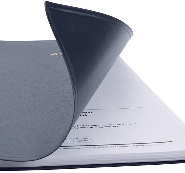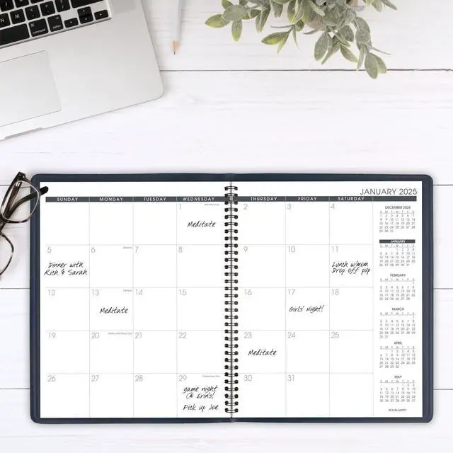 Planner has a navy faux leather cover and twin wire binding to help prevent snags and secure pages