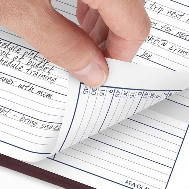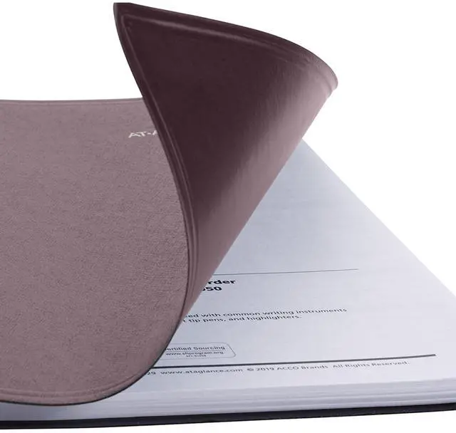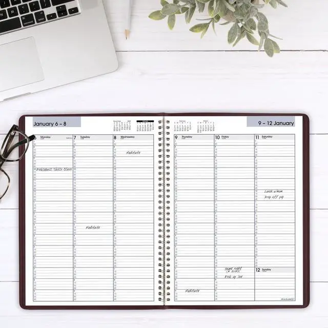 Planner has a durable burgundy cover and twin wire binding to help prevent snags and secure pages