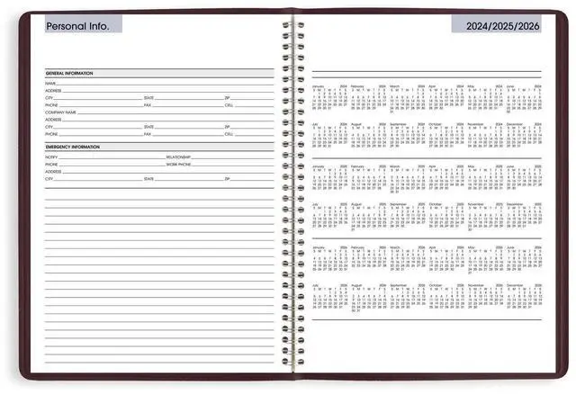 Special pages include a 3-year reference calendar, personal information and important dates