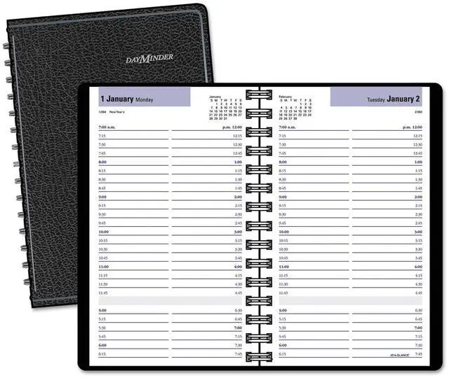 One page per weekday format with ruled, quarter-hourly appointments from 7:00 a.m. - 7:45 p.m. Weekend pages are condensed with Saturday appointments from 7:00 a.m. - 4:45 p.m. Pages measure 5" x 8".