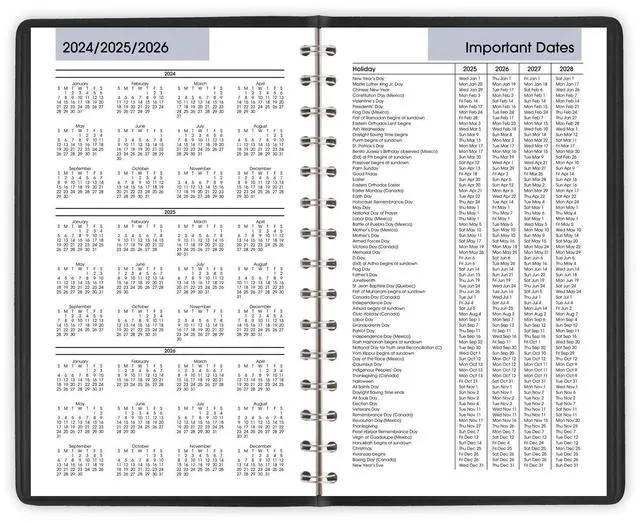 Special pages include a 3-year reference calendar, important dates and future planning pages