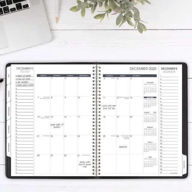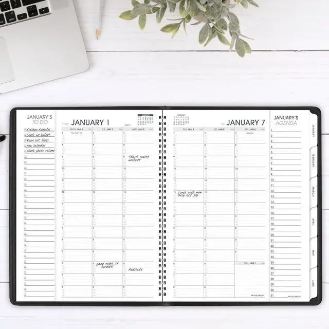 Tabbed monthly spreads have unruled daily blocks, a column to track your to-do's and space to organize your agenda