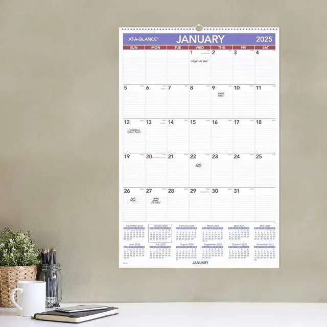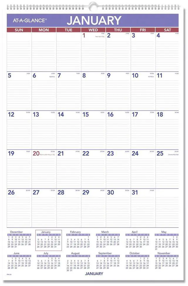 Monthly pages have ruled daily blocks and a full year of reference calendars for quick date checking. Pages measure 20" x 30". Daily blocks measure 2 11/16" x 4 3/8".