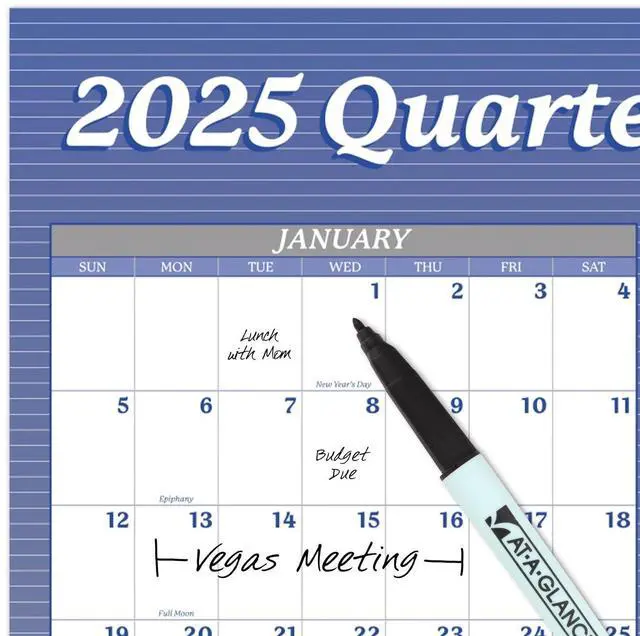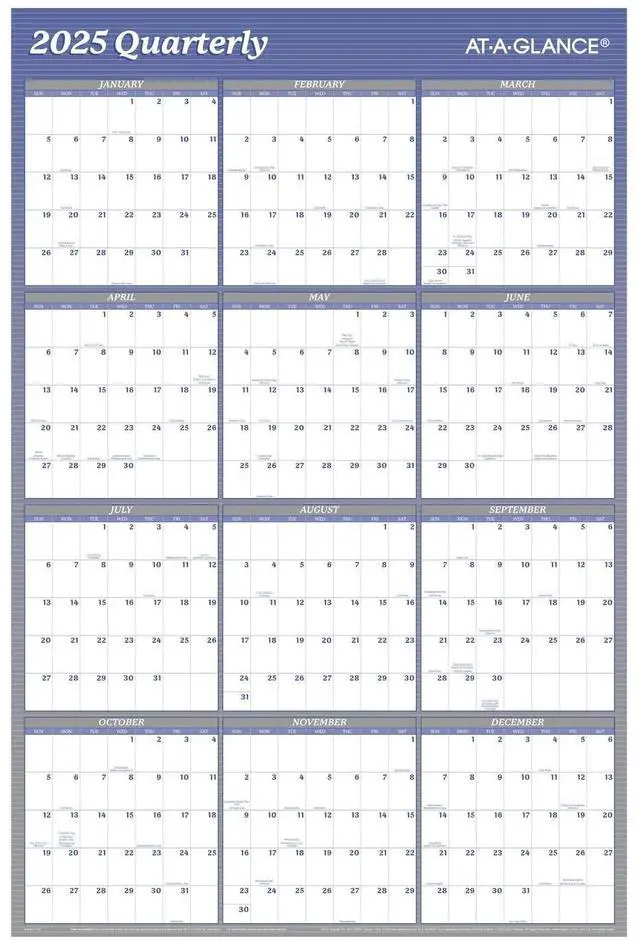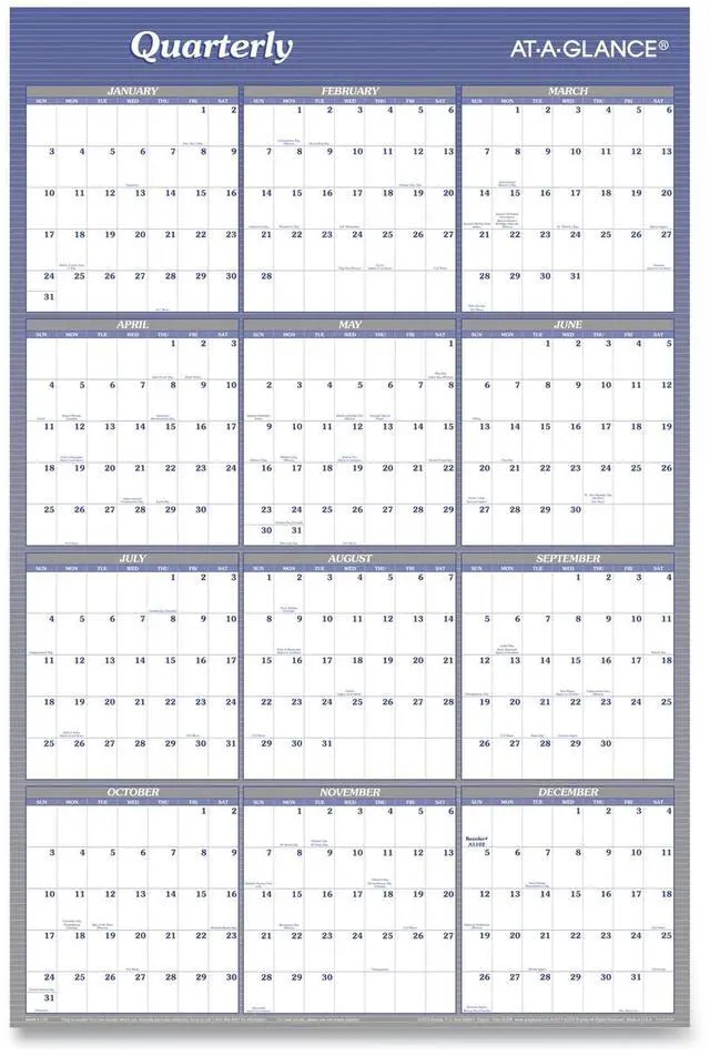 Reversible calendar shows all 12 months in vertical layout on one side and horizontal on the other. Choose the orientation that best fits your workspace.