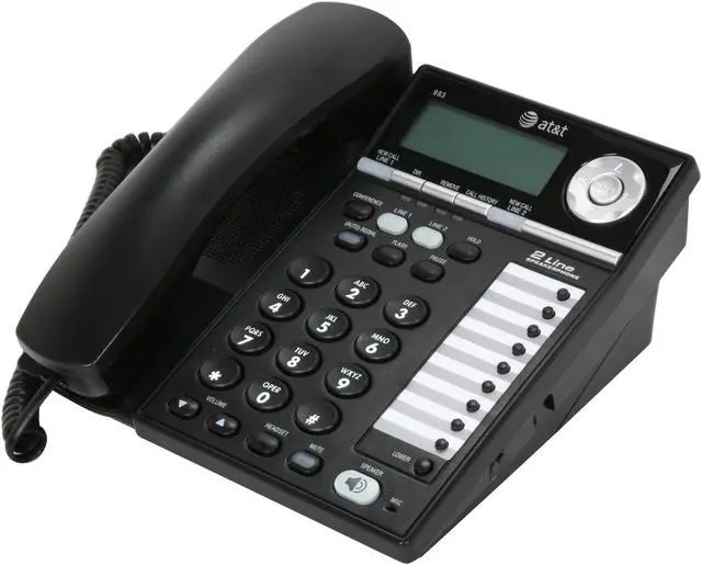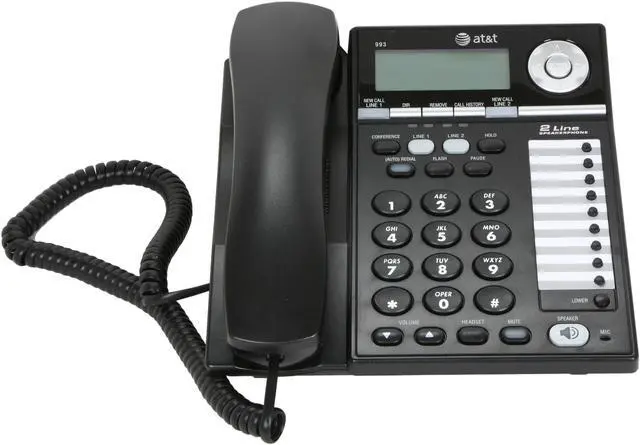 The AT&T 993 2-line corded speakerphone is the perfect solution for a small business in need of a phone with two line support. The speakerphone in the base station allows hands-free communication and the party conferencing features lets you conduct business with up to three participants.