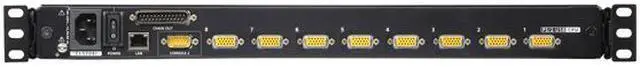 | PC Connectors | External Console Ports: 1 x SPHD-18 Male (Yellow) External Mouse Port: 1 x USB Type-A Female USB Port: 1 x USB Type-A Female KVM Ports: 8 x SPHD-17 Female Daisy Chain Ports: 1 x DB-25 Male Firmware Upgrade: 1 x RJ-11 Female LAN Ports: 1 x RJ-45 Female Power: 1 x IEC 60320/C14 |