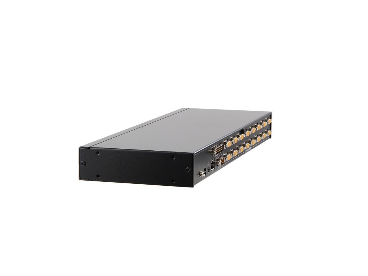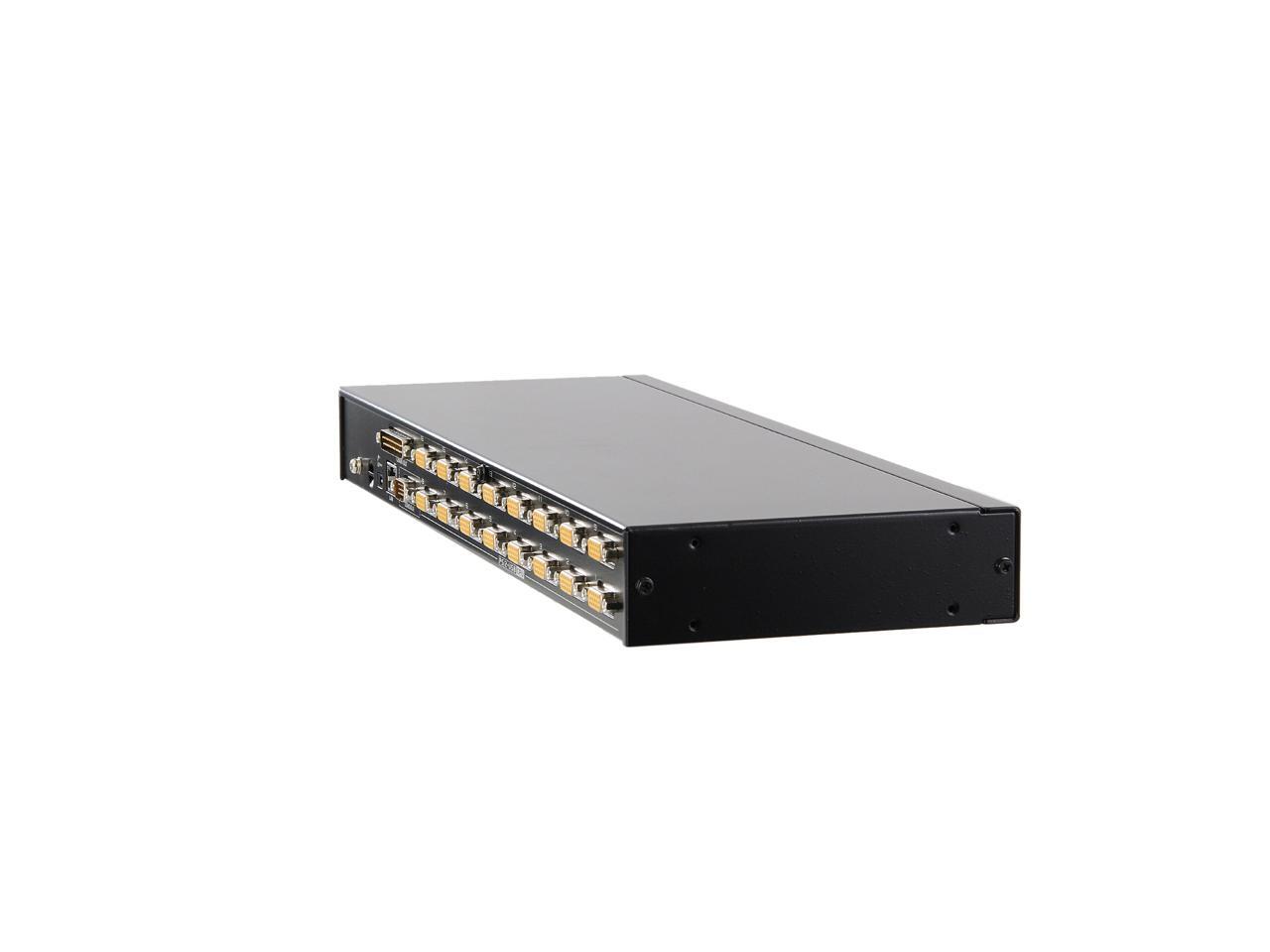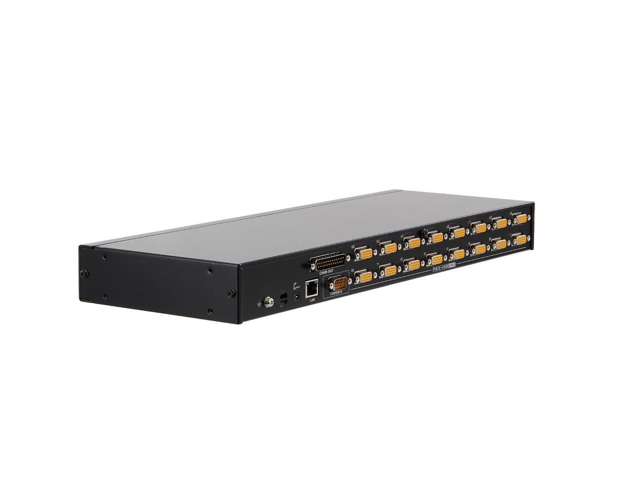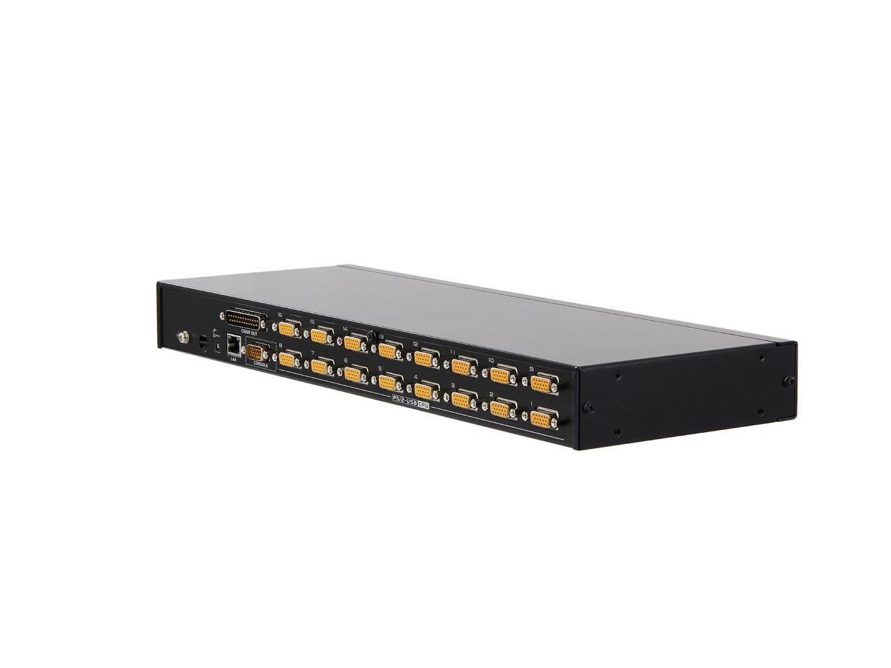 | Features | 16-port remote access KVM switch - monitor and control up to 8 computers from a single KVM console Daisy chain up to 15 additional units - control up to 256 computers Auto-sensing of station's position on daisy chained installations; no need for manual dip switch setting; front panel LED indicates station's position Multiplatform support - Windows, Linux, Mac, and Sun Dual Interface - supports PS/2 or USB keyboard and mouse computers Video DynaSync - stores the console monitor's EDID (Extended Display Identification Data) to optimize display resolution Superior video quality - up to 2048 x 1536; DDC2B for the local console; up to 1600 x 1200 @ 60Hz / 24 bit color depth for remote sessions BIOS-level access Mouse DynaSync Rack mountable in a 19" system rack |