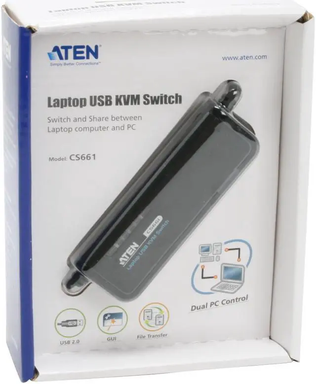 | Features | KVM functionality (dual PC control) - allows you to control both your Local computer/laptop and a Remote computer/ laptop via the Local computer Port USB 2.0 hub built in - allows the Local computer to connect to USB 2.0 peripherals Compact design, built-in all-in-one USB 2.0 cables - enables high-speed data transfer Transfer speeds up to 12MB/sec. Intuitive GUI for easy operation File system management utility allows you to transfer files between two computers/laptops - simply drag and drop Plug and play - installation software is auto-run Desktop scaling - user can adjust the size/resolution of the Remote desktop window by size or ratio Non-powered |