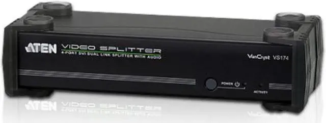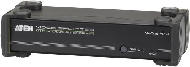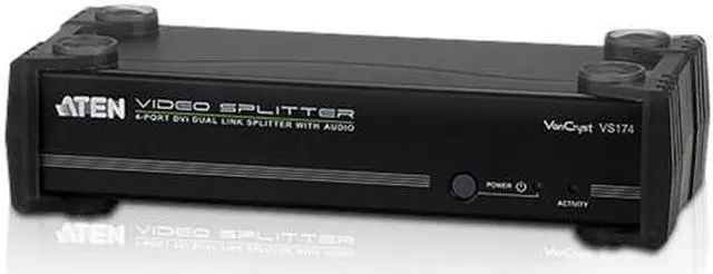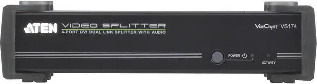 | Features | TECHNICAL SPECIFICATIONS:General InformationManufacturerAten TechnologiesManufacturer Part NumberVS174Manufacturer Website Addresshttp://www.aten.comBrand NameVanCrystProduct ModelVS174Product Name4-Port DVI Dual Link Splitter with AudioMarketing InformationThe VS174 4-Port DVI Dual Link Splitter with Audio combines DVI quality video and audio, taking signals from an audio/ video source and replicating them to four audio/video outputs. This video splitter uses dual link technology, which offers high bandwidth capacity for added transmission power and faster refresh rates, thereby providing better video quality of viewing resolutions up to 2560 x 1600.Packaged Quantity1Product TypeSignal SplitterInterfaces/PortsPorts1 x DB-9 Female - Serial,1 x Mini-phone Stereo - Stereo Audio In,1 x DVI-D Female - Digital Video In,4 x Mini-phone Stereo - Stereo Audio Out,4 x DVI-D Female - Digital Video OutPhysical CharacteristicsHeight2.2" (55.5 mm)Width8.3" (210 mm)Depth3.5" (88 mm)Weight (Approximate)730 gMiscellaneousPackage Contents 4-Port DVI Dual Link Splitter with Audio 1 x Power Adapter 1 x User Instructions Green CompliantYesGreen Compliance Certificate/AuthorityRoHS,WEEE |