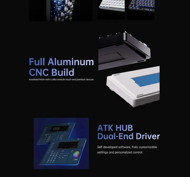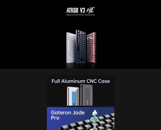 The ATK 68 V3 is a 65% eSports keyboard built around Hall Effect magnetic switches. It features a full CNC aluminum case with a tray-mount structure and an aluminum position plate for consistent, sturdy performance. Per-key actuation is adjustable from 0.005 to 3.3 mm in 0.001 mm steps, allowing precise tuning for gaming or typing. Cherry-profile PBT/PC keycaps and multiple colorways complete a compact, premium setup.