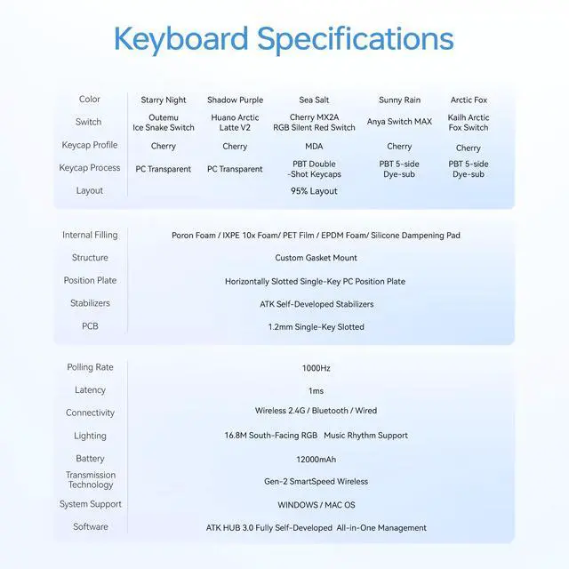 A compact 98-key tri-mode mechanical keyboard with gasket mount and hot-swappable design for smooth, customizable typing. Powered by a 12,000 mAh battery and 1 ms low latency, the ATK A98 Pro delivers premium performance and style for gaming or work.